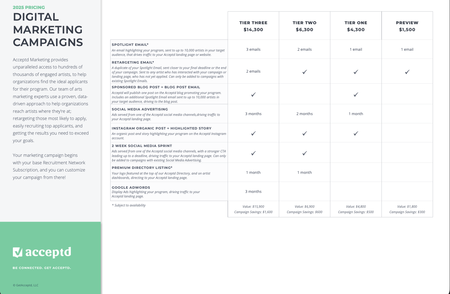 Every arts organization is different. Different goals, audiences, and budgets. With tiered plans starting at $1,500, our Marketing Services team makes a streamlined recruitment process accessible to everyone. Choose a tiered campaign or customize a plan to fit your needs.