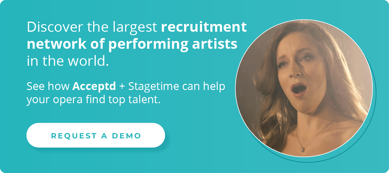 The Acceptd + Stagetime partnership can also work for any type of opera, from full-time professional companies hosting seasonal auditions to summer festivals and fellowship programs. If you have any questions about how the platform can work for your organization, don’t hesitate to reach out!